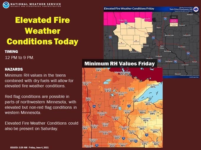"Hot conditions are expected today, with elevated fire weather conditions in portions of western, northern, and northwestern Minnesota," says the National Weather Service. "Humidity will be low today, so heat index values will stay near actual temperatures."
