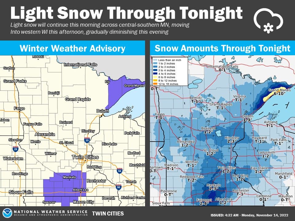 "Light snow which developed overnight will continue through the rest of this morning across central-southern MN, then move into western WI late this morning through this afternoon, and gradually diminish this evening," the National Weather Service said.