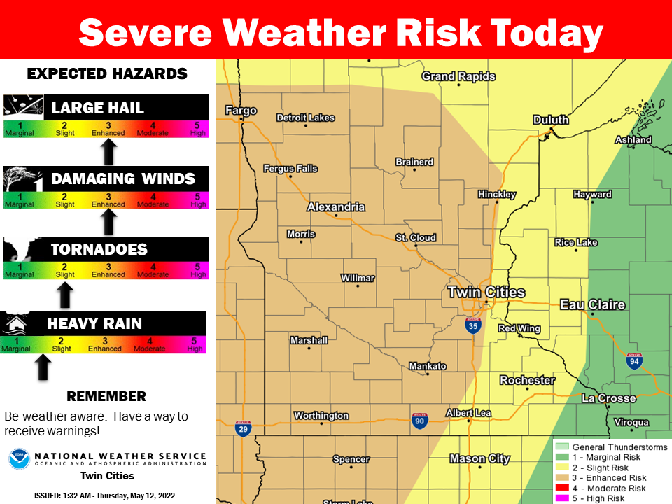 "Another Enhanced Risk for Severe Weather is expected today, with some elevated storms in western Minnesota possible early in the morning and a better chance for more widespread severe weather during the afternoon and evening," NWS said.