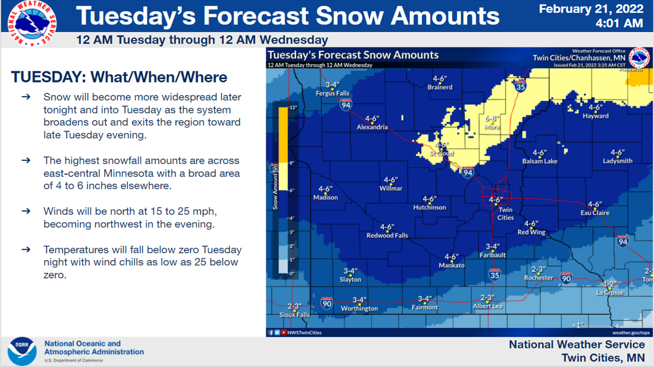 Tuesday will bring heavier snow, between 3 to 7 inches of additional snow to the Twin Cities, according to the National Weather Service.