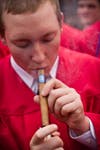 The heat and humidity was in effect outside, but the air conditioning was being pumped inside to keep the Haben Center cool for the packed house. The concert band played the traditional "Pomp and Circumstance" as the graduates filed into the hall.