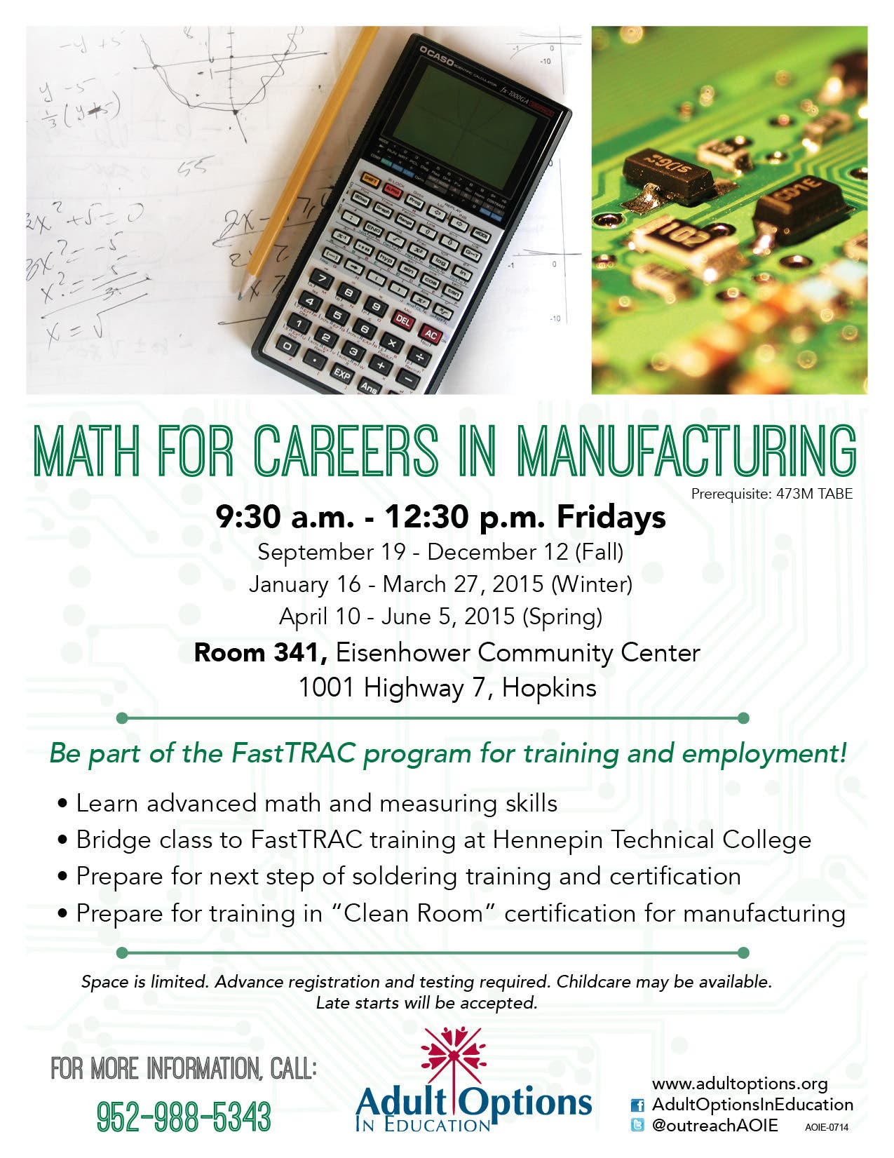 Interested in a career in manufacturing? Looking to make a new start? Adult Options In Education is offering Math For Careers In Manufacturing, a bridge class to FastTRAC training at Hennepin Technical College (HTC). This class focuses on advanced math and measuring skills needed to work in manufacturing. The class starts on Friday, September 19 and runs until December 12. Late starts will be accepted.