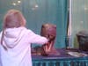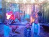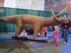 Around the corner was our first dinosaur. They both took off running, sticking their hands in its mouth, and petting it. It didn't take long for Anthony to realize that if you push the butttons, the head, mouth and tales of the dinosaurs moved. He had them making all kinds of noises and shaking their body parts. Kailey took the time to listen to me read about the dinosaurs; only because she wanted to know if it was on our "hunt".