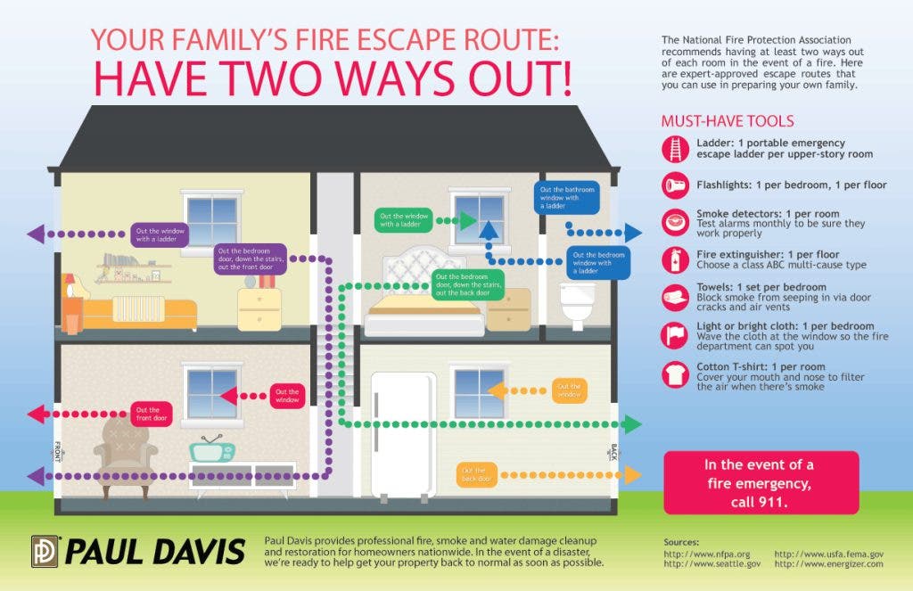 HAVE TWO WAYS OUT! The National Fire Prevention Association (NFPA) recommends having at least two ways out of each room in teh event of a fire. Here are the Paul Davis & expert-approved escape routes that you can use in preparing your own family. (see photo)