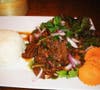 An entree of the signature Nam Tok Beef ($8.95 for lunch; $18 for dinner) was again only a little spicy, but you knew it was there. The beef dish with sliced sirloin tossed with red onions, chili powder and lime juice was served sprinkled with fresh cilantro on the top, which lent a garden freshness. The sirloin was chewy-tender perfect. My meal was served with both regular and sticky jasmine rice.