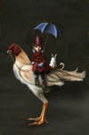 One of the pieces she will sell at this year's fair features a young boy in period clothing that includes a top hat. He is holding an umbrella and sits, alongside a cat, on the back of a chicken. Adams calls the piece, βPortrait of a Young Poulqestrian.β
