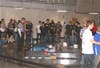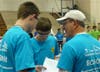 The two Eureka High School teams — Meson Subatomic Particles (in red shirts) and Boson Subatomic Particles (blue shirts) in the accompanying photos —were knocked out in the best of three semi-final matches by a score of 2-1. Team Boson, #3658, was a finalist in the innovative design category. Their mentor, Douglas Rohrer, PhD, also was a finalist for the Compass Award, given to a mentor who exhibits dedication and inspiration.