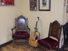 Beardsley’s comfortable and welcoming shop is a charming step back in time, with antique barber chairs, an old, oak buffet holding coffee supplies and antique barbering tools in a shadow box. Vintage chairs sit next to a guitar, and customers are invited to sit down and strum a tune or two if they like. Beardsley is a guitar picker himself, favoring gospel music.