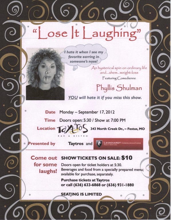 Taytros and Leonhardt Communications present Phyllis Shulman and her stand-up comedy in "Lose It Laughing". Doors open at 5:30 for beverages and food orders from a specially created menu. Comedy show starts at 7:00 pm and tickets are required ($10). Food and bev may be purchased separately. Tickets at Taytros - or - by calling 636.633.6868.