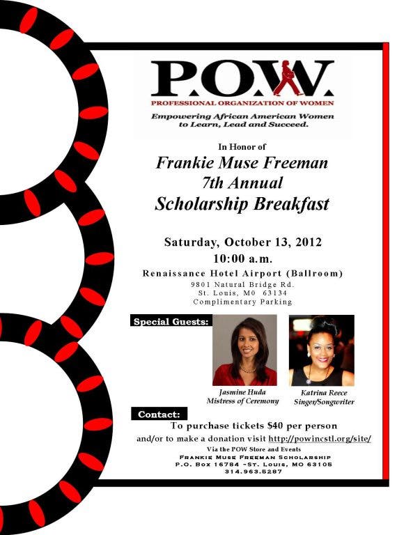 Please join us (P.O.W.) as we host our 7th Annual Frankie Muse Freeman Scholarship (breakfast) event. The Frankie Muse Freeman Scholarship was established in 2005 to generate funds for non-traditional students to pursue their educational endeavors.