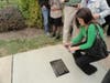 Suzanne Eagan, wife of the late mayor, along with several other of her family members, stood by as Mayor Schneider unveiled the plaque along the sidewalk in front of City Hall.