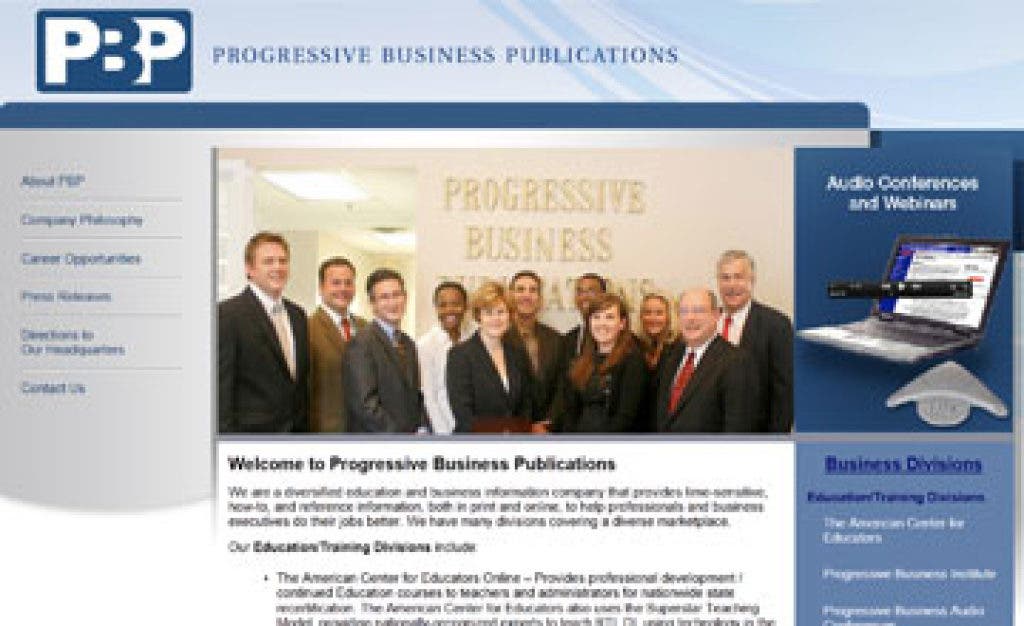 On its website, Progressive Business Publications describes itself as a “diversified education and business information company that provides time-sensitive, how-to, and reference information, both in print and online, to help professionals and business executives do their jobs better.” The site says the company’s publishing division produces 25 newsletters for businesses, nonprofits and medical companies.
