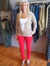 If color-blocking isn't in your style wheelhouse, you can also go for a more neutral look that uses the red jeans as a brilliant pop of color. Paperdolls has a cute khaki deep-V crocheted Jack cardigan ($74) that looks great with the jeans, a white Idea cami ($28), camel-colored Tracy Reese heels ($100) and a gold statement necklace ($46) for a bit of fun.