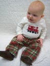 For a six-month-old baby boy, try a two-piece Gymboree outfit ($8.99) that includes a long-sleeved white top with a train design and a pair of green and red plaid pants. Make the ensemble complete with a pair of brown Bobux soft-soled shoes ($9.99).