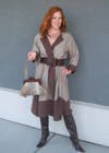 For a fall-ready dress, go for a tan and brown Eskandar linen wrap dress ($275), which looks great when paired with a brown Kristen Kahle belt ($65), an Anthony Luciano snake skin bag ($795), brown Emanuel Ungaro boots ($240) and an amber crystal necklace ($15).
