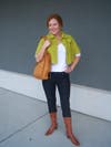 For a cute casual look that's ready for fall, try a pair of David Kahn skinny jeans ($50) with a white Eileen Fisher tee ($18), a lime green August Silk wool blazer ($35), brown Ann Klein boots ($45), a tan Addore elk skin saddle bag ($175) and gold Lee Angel chandelier earrings ($40).