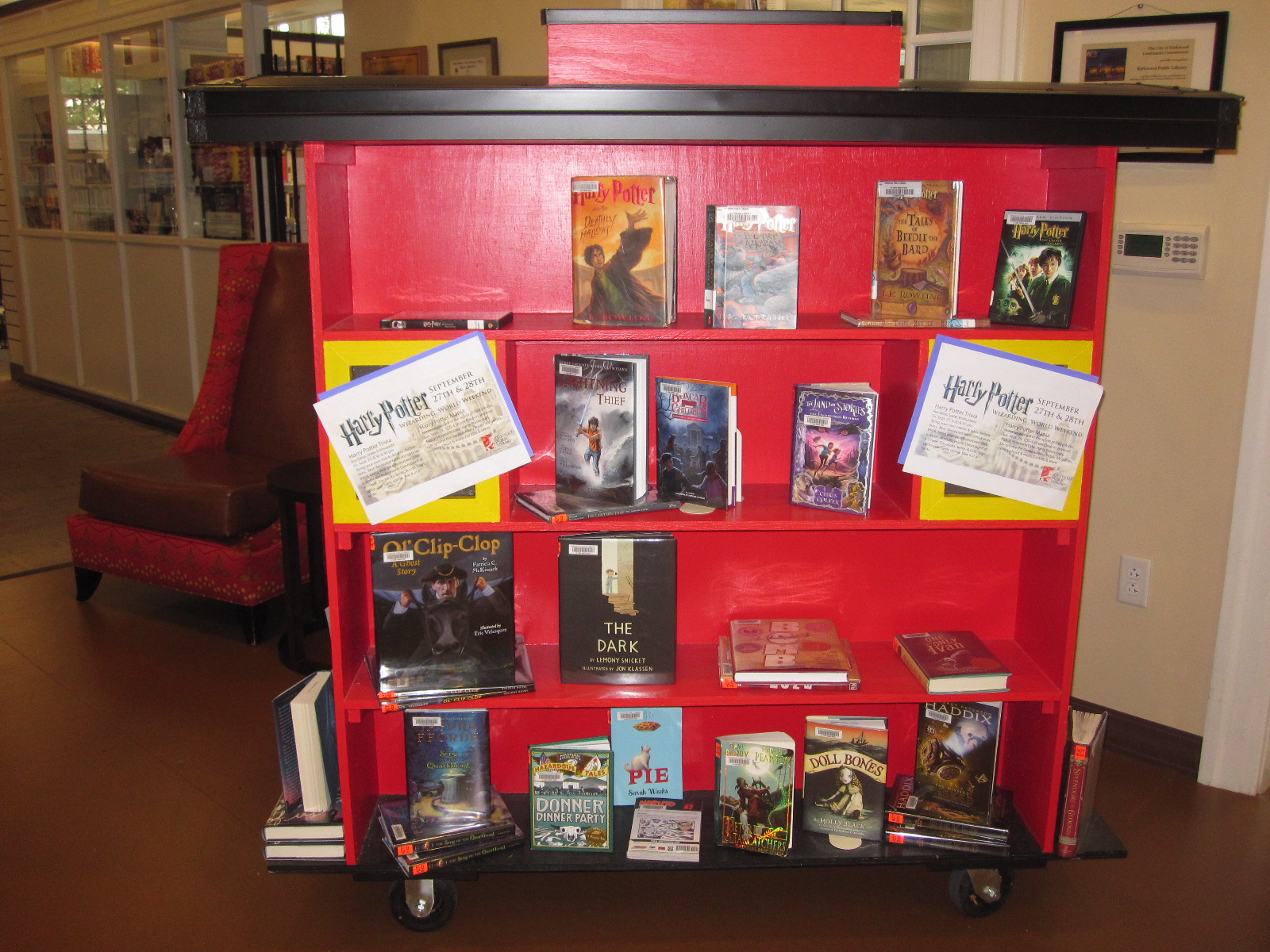 Our Book Caboose had a great summer at the Kirkwood pool. It was very popular with lots of books flying off its shelves. With the pool closed, and a terrific summer in the rearview, the caboose is wintering in the library's front lobby. It is filled with all the most popular releases: chapter books like The Coldest Girl in Coldtown by Holly Black and Guardians of Ga'Hoole: The Rise of a Legend by Kathryn Lasky and the newest picture books from favorite authors Anna Dewdney and Laura Numeroff. Hot copies check out for two weeks.