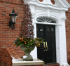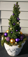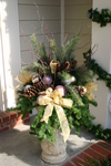 - Many people today already have planters or pots at their front doors that hold plants during the spring and summer. Try dressing the plants in them with simple touches like adding a bow to the tops of potted evergreen trees, adding ornaments to them or lining the bases with staked pinecones. Evergreen plants will easily endure the harsh weather during the winter season and a little bit of trim will create a strong effect. Sconces that flank a front door can be quickly transformed by tying fresh evergreen and pinecones to hang below them.