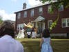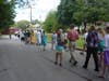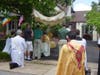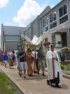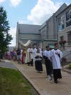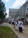 The procession made its way through the neighborhood, with parishioners following, singing songs and carrying flowers. The procession stopped at three homes, where an act of Benediction was made. All in attendance knelt for this solemn blessing. The procession moved along Manchester Road, returning to the church for a final blessing. Afterwards, parishioners gathered for lemonade and cookies outside the church.
