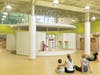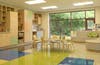 The decor in the center uses colors that are natural, rich and bright instead of the neutral tones used in many traditional school buildings. Flooring materials include bamboo and tiles patterned like grass, giving the space depth. There are also plenty of windows.