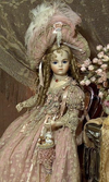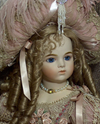 A lovely picturesque hat made with the same fabrics as the gown and topped with ostrich feathers and a rhinestone brooch. She carries a cone shaped silk purse with a tiny doll and bear. She was created in 2005. I took these pictures off the internet. These dolls go for upwards of 2000 dollars and I am selling mine for 1,400 dollars obo. Thank you. CASH ONLY, NO SHIPPING, CASH ONLY