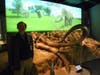 On the other side of the entrance, a replica of a partially excavated mammoth skeleton, with curved tusks projecting out, rests at the base of a large screen that allows visitors to travel back to the days of mammoths and mastodons. It starts with a view of downtown St. Louis as it appears today before going back in time. With a counter showing how long in the past the view on the screen is, buildings deconstruct and disappear, then older buildings appear, then the land alternates between lush forest and Pleistocene ice and snow before finally reaching 20,000 years ago. At this point, woolly mammoths arrive, wandering the grassy savannah and trumpeting like elephants.