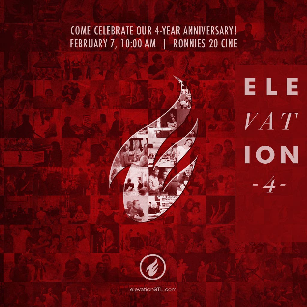 Elevation Church meets Sundays at 10:00 am at Ronnies 20 Cine in Auditorium 11: 5320 Lindbergh Blvd., St. Louis, MO 63126. For more information, visit elevationSTL.com.