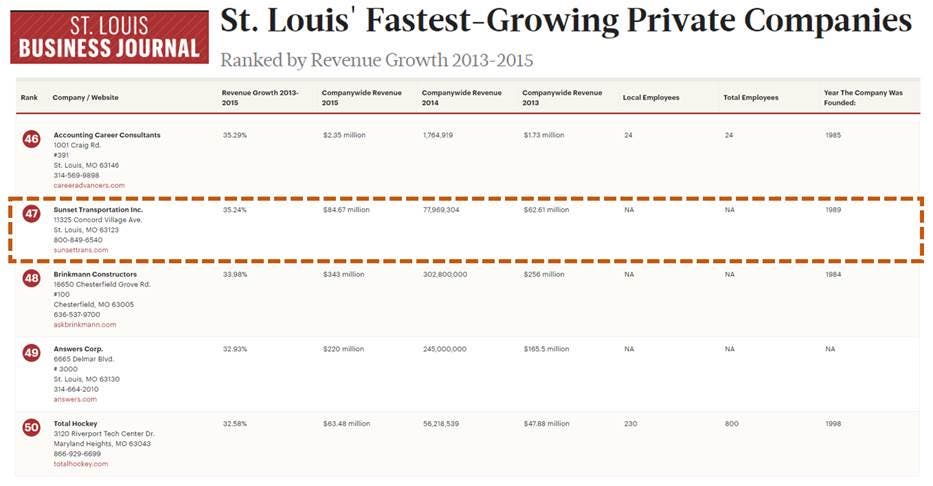 Each year, the St. Louis Business Journal recognizes private, locally-owned businesses that have the most accelerated growth in the past three-year fiscal cycle. For the first time, Sunset Transportation earned this distinction, ranking in the top 50 companies and reporting a 35% increase in both revenue and personnel between 2013-2015.