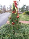 PINE ROPING USE #2- Wrap a topiary form. I have a large, green planter in the front yard, by my sidewalk. In the summer I grow a Mandevilla vine up a wire support that is in the shape of a pyramid.  Normally, it sits naked until the next spring. Not this year! I used about 3 yards of roping, tying the end to the top of the support. I slowly wound the roping around the form, in a clockwise pattern, pulling tight as I worked my way to the bottom of the wire form. Lastly, I tied the end of the roping to the wire support. Luckily, I had a few yards of ribbon left that matched my mailbox and front door decorations. I even found a dozen red, plastic ornaments that I bunched together as decoration. I am pretty pleased with the way it turned out. I think it looks like a Christmas tree.