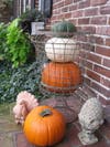 I had some pitiful Caladiums that had given up the fight. Into the yard waste dumpster they went. I bought a darling metal vase at Home Goods. I admit it…I am a Home Goods junkie. Rarely do I leave that place empty handed. I placed 3 pumpkins inside the vase. One stacked on top of the other. Brilliant! Smaller gourds and pumpkins were stacked as well. I potted up a few Mums into a terra cotta planter and I was finished! I stood back, relishing the masterpiece I created in less than 4 hours. My “Ode to Fall” display costs less than a nice dinner out- and I have all of October and November to enjoy it.