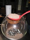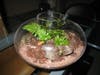 We placed about ½” to 1” of the charcoal (I suggest using a large spoon) in the bottom of the terrarium. George also added an aquarium product called “Fluorite.” It resembles brown aquarium gravel, and is beneficial to aquarium plants.