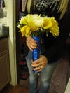 Since I have no experience knowing how long the flowers we chose will last without water, I asked Megan to refrigerate her bouquet and take it to work the next day. She said that the Tulips drooped and the Eucalyptus withered. The Roses, Mums, Calla lilies and greenery looked great all day, even though they weren’t in water.