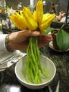 The hardest part of making the bouquet is working with so many stems. We probably had 18 stems by now and it was time to add the Tulips. It was really beginning to take shape. We alternated the brilliant yellow Calla lilies with the yellow tulips. It was nice, but I had the sense that you lost the elegance of the Calla lilies with Tulips next to them.