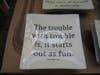 I spied a charming collection of glass dishes that have a quote on each. My favorite is: “The Trouble with Trouble is that it starts out as Fun.” There’s a large collection with quotes from Coco Chanel, Humphrey Bogart and other notables. They’re a little pricey at $60, but there just might be one quote that fits your friend perfectly!
