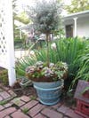We used a really eye-catching plant for the spiller. The common name is “String of Pearls” and it’s one of my favorites. It really does look like strands of pea-green pearls. They are slow growing, so be patient. The pillar plant we used in a few of the containers was the unusual Sansevieria we picked up at Bowood. We had a large, colorful variety of Echeveria for the fillers.