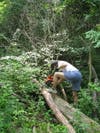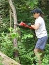 The workday began with a fair amount of skepticism. No one believed that this puny chainsaw was capable of much. Nancy told us that she had been clearing out honeysuckle around the lake where she lives. She was beaming, singing the praises of her “best tool ever.” She said it was capable of cutting a tree with a 4” diameter. No one believed her.