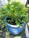 Karen has a real artist’s eye in her garden. She displays crystal doorknobs on metal rods in between her Ferns. They sparkle in the sunlight. She groups galvanized watering cans on tables as if she’s planted them there. A mailbox holds gloves and tools so they are always ready. Karen’s garden held surprises around each corner, including a darling Praying Mantis, looking as if it was devouring a large Hosta leaf. As George and I left, I made a mental note to add something whimsical, like the doorknobs, to my own garden.