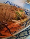 Pad thai, or phat thai, is a full flavored dish of stir-fried rice noodles with cooked and chopped eggs, bean sprouts, fish sauce, tamarind juice and red chili pepper, garnished with crushed peanuts, cilantro, lime and green onions. Protein added to the dish is usually a choice of shrimp, chicken or tofu.