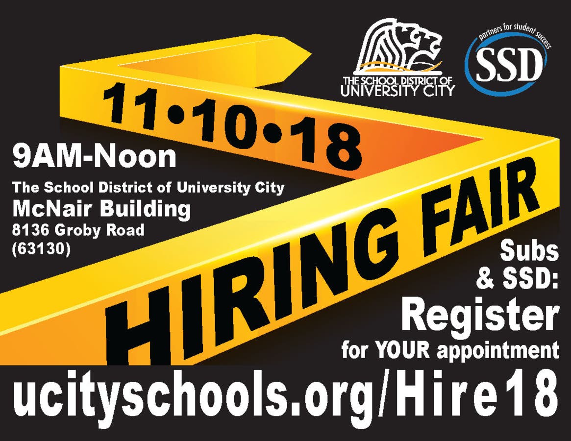 The School District of University City and the Special School District of St. Louis County will host a hiring fair on Saturday, Nov. 10, 2018 from 9 a.m. to noon at the McNair Administration Building (8136 Groby Rd. 63130) in University City. The fair is intended to fill substitute teaching positions within The School District of University City, as well as paraprofessional and teacher-level positions with the Special School District.
