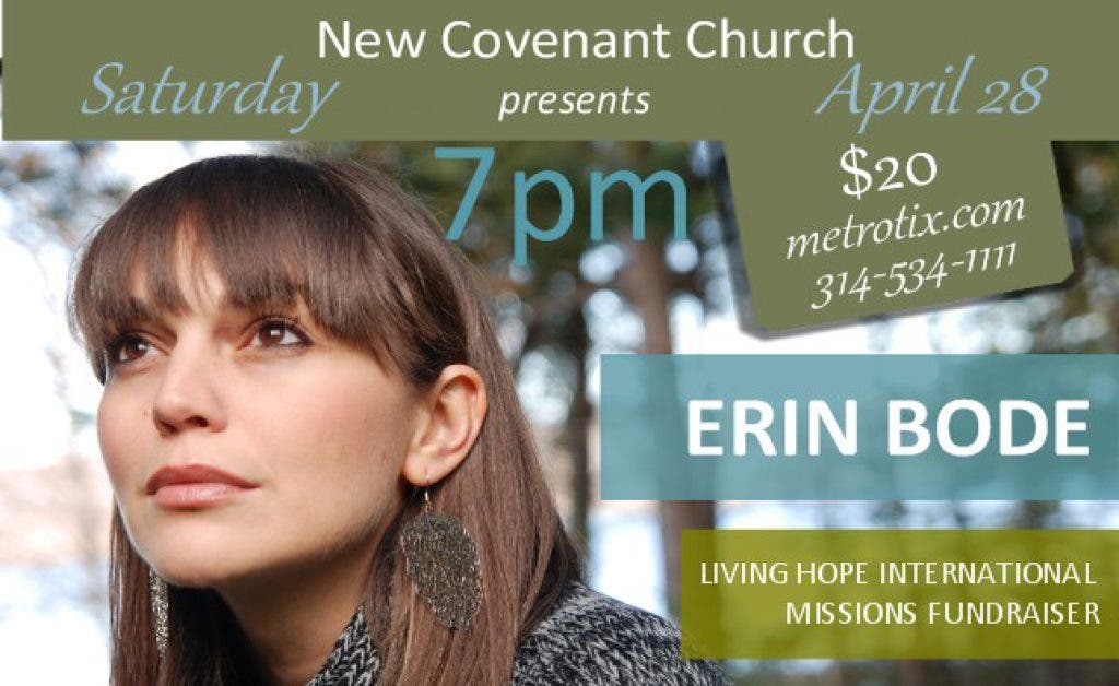 At New Covenant Church, Erin Bode will be performing to help raise money and awareness for our charity Living Hope International. This will be a fantastic evening of music. All the proceeds of this event will go directly to thse who we are helping around the world.