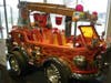 The sizzling red vehicle has red-orange flame decals along the sides, orange-and-yellow seats, two flashing lights and a small ladder mounted on top. It even has a 100-gallon water tank and pump system.