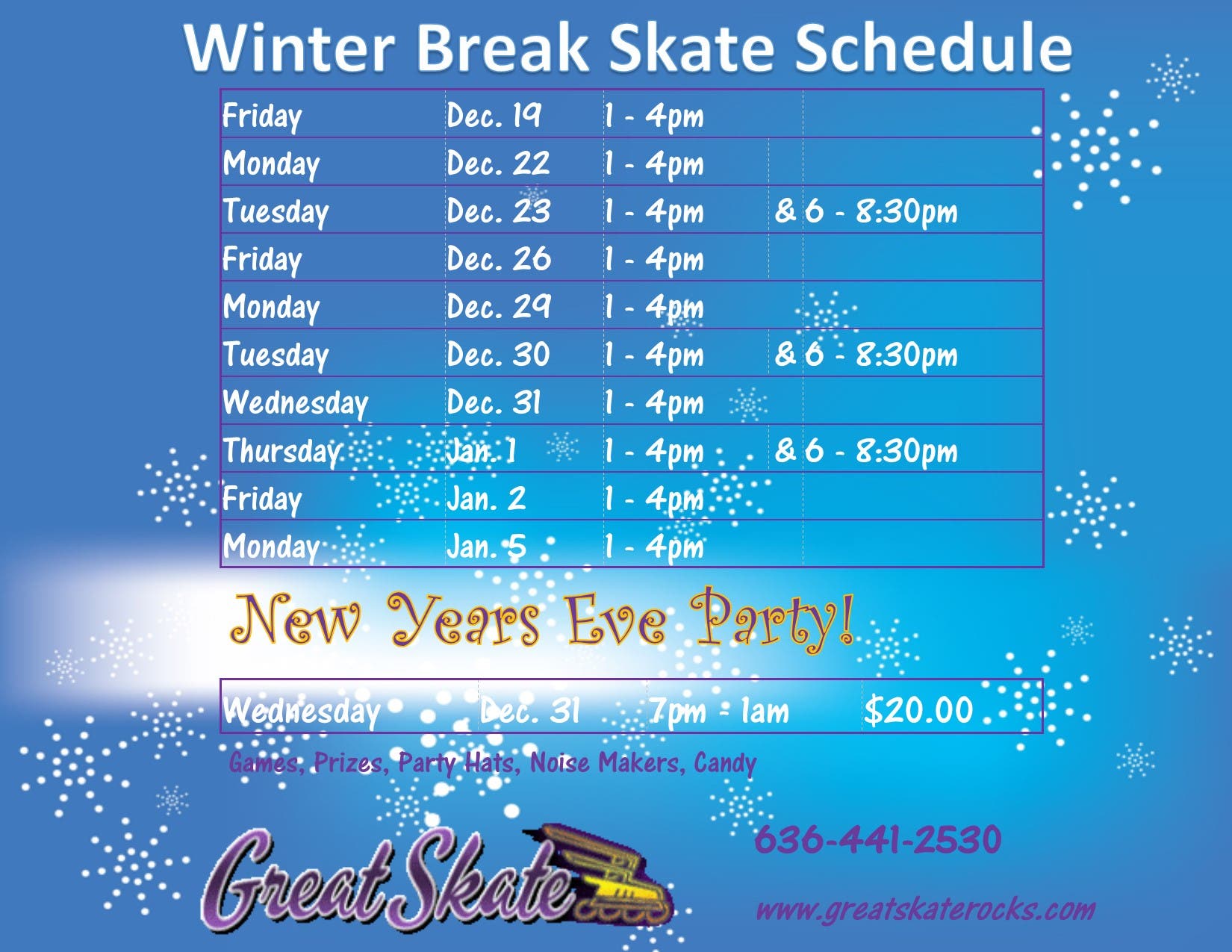 School is OUT! Great Skate is OPEN with Special Winter Break Skate Dates: