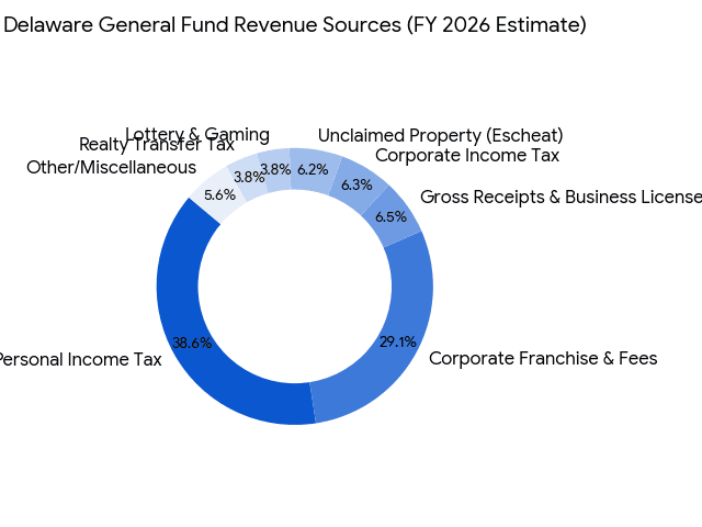 According to FY 2026 revenue estimates, corporate franchise taxes and fees account for a staggering 29 percent of the state’s general fund. That makes Delaware a national outlier: while the average state receives less than one percent of its revenue from such fees, Delaware generates billions from companies that may never set foot in the state.