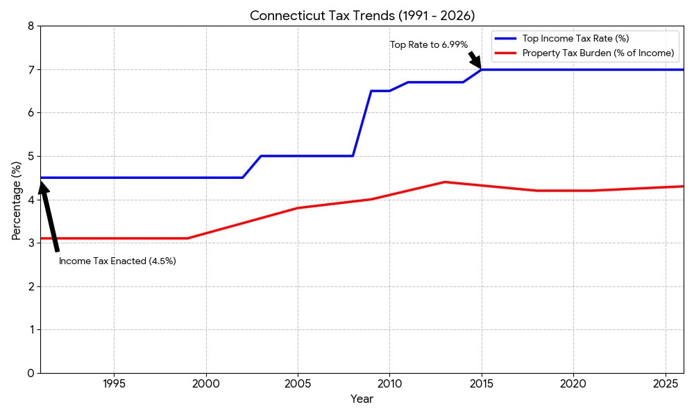 Income tax rates vs. property tax burden in Connecticut since 1991.