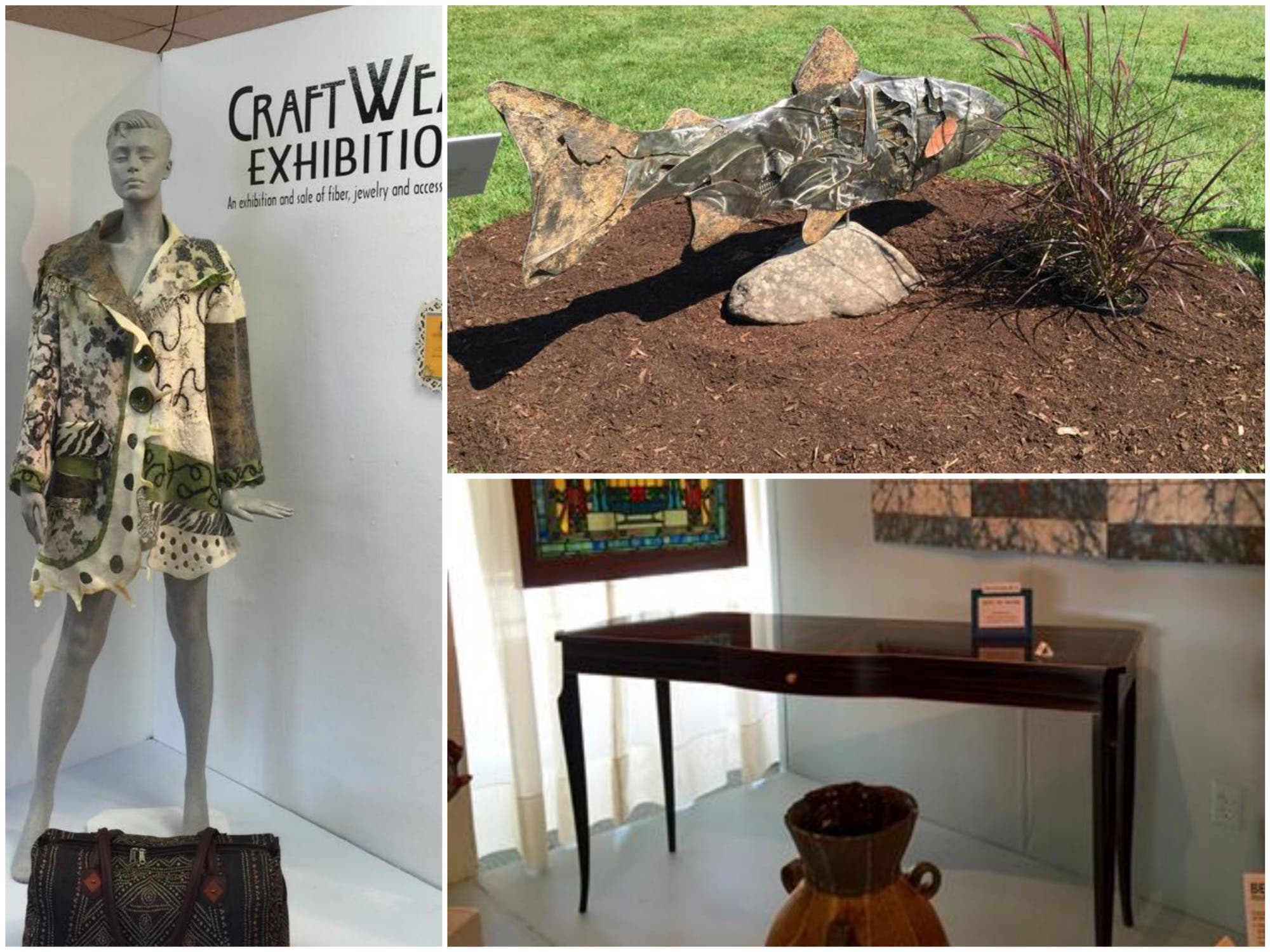 Caption: Nancy Evans won for Best in Show in the Craft Wear exhibition for her green tea coat; Joseph DeRobertis’ Steel Fish won Best in Show in the Sculpture Garden category; and Terry Moore won Best in Show in the Living With Craft exhibition for this sonsole table.