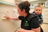 Sara Melone nods in the affirmative when asked if she subscribes to "attachment parenting." It's a fair question, considering she's mopping the floor like nobody's business, with baby Edison strapped to her back.