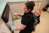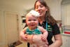 "I wear him all the time, even when I'm not cleaning," says Melone, making another pass with her mop at the far end of Katie Olivier's kitchen floor. Nearby Brosnahan is surface cleaning a counter top, her own baby, Cecilia, neatly tucked next to her mother's chest in a carrier strapped over her shoulders.