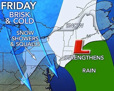 Expect hazardous snow squalls and wind to be light, at first, but then gusting on Friday to 25 mph.