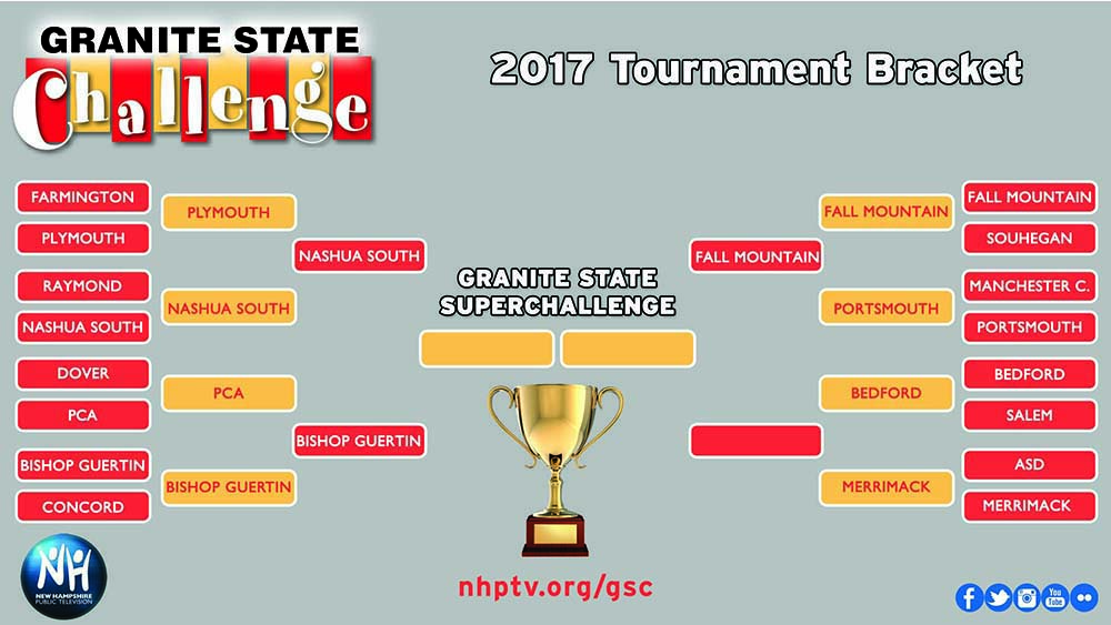 Watch Granite State Challenge Saturdays at 6 p.m. on NHPTV PRIME and NHPTV EXPLORE or live on Facebook: facebook.com/NHPTV. All games are available to watch online at video.nhptv.org. Online GSC quizzes keep students and audiences involved in the fun. nhptv.org/gsc