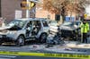 Captions: Alexander Burke was arrested this morning after being treated at Catholic Medical Center. A Manchester Police accident reconstruction team analyzes the crash scene on Nov. 29, 2015. Credit: Jeffrey Hastings/Frame of Mind Photography FrameofMindPhoto.com.